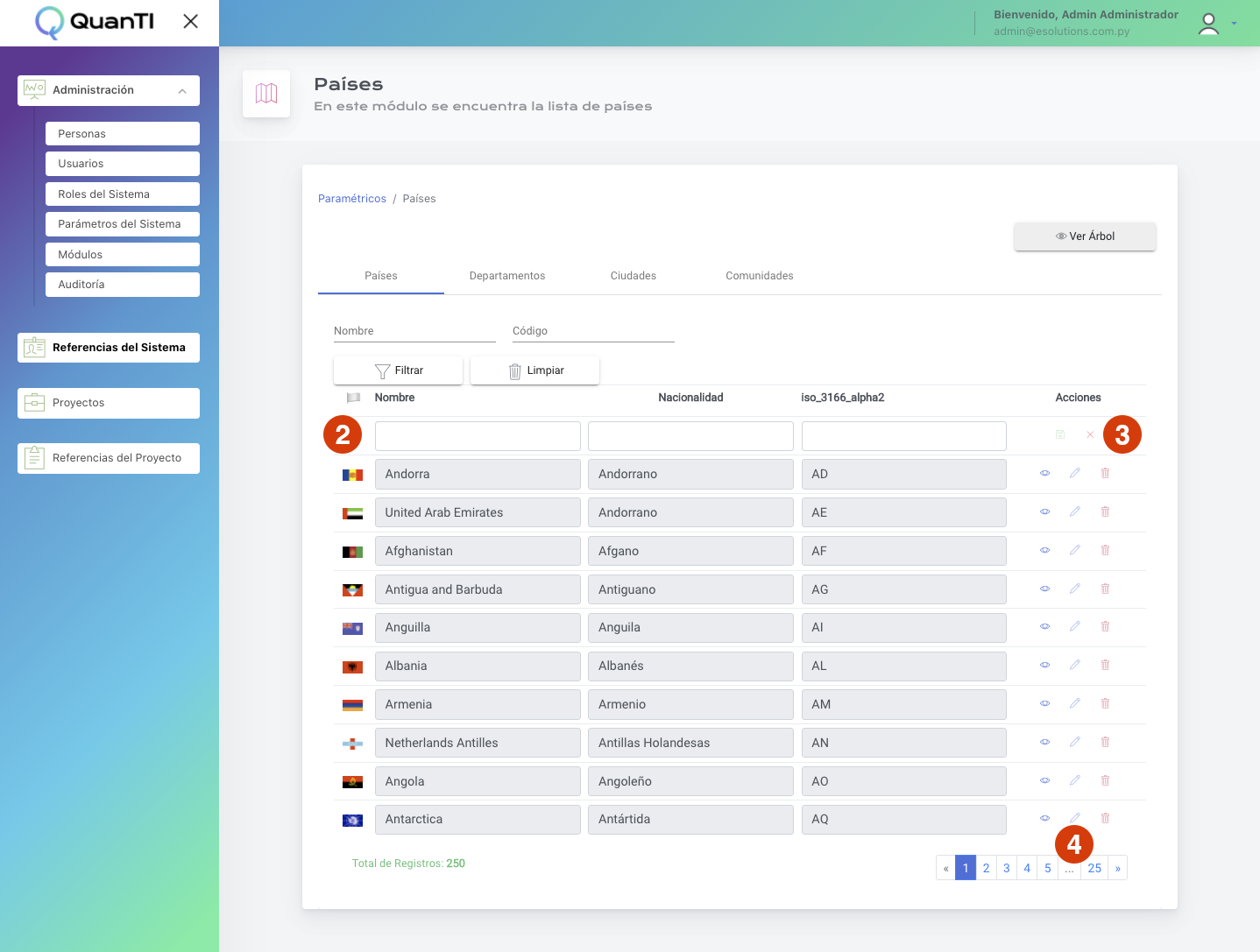 - Para editar un país, haga clic en el ícon del lapiz y guardar para finalizar la edición o X para descartar cambios